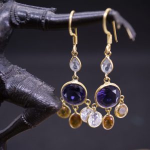 Boucles d’oreilles Kama plaqué or 3 microns et gemmes d' améthyste, de citrine et zircon.